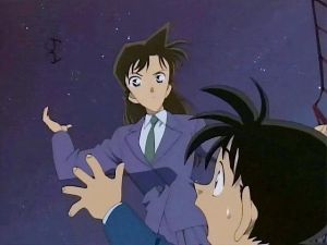 Dans l'épisode 96, rentrant de cours, Ran trouve Conan endormit sur le canapé de l'agence: elle lui enlève ses lunettes pour qu'il soit mieux, et se rend alors compte que ce visage enfantin lui est extrêmement familier. La cliente qui vient les voir juste ensuite l'amène à sortir un album photo, où, voyant une photo d'elle-même et de Shinichi étant enfant, elle se rend compte que ce dernier et Conan sont exactement semblables. Elle va alors surveiller discrètement Conan durant toute l'enquête: à l'issue, elle l'emmène devant le domicile Kudo, et le confronte à ses déductions: la ressemblance de visage au même âge, le talent pour les déductions, et même l'absence de tout talent musical. Toutefois, Yukiko Kudo survient de façon inattendue, et quand Ran lui demande de confirmer que Conan et Shinichi, elle couvre ce dernier en expliquant que Conan est un parent éloigné qui adore Shinichi et l'a donc prit comme exemple; Ran a d'abord bien du mal à y croire, mais Conan fait mine d'avoir peur d'elle en se réfugiant derrière Yukiko, et dès lors, Ran ne peut plus croire, du fait de sa manière d'agir, qu'il s'agit de son ami d'enfance: elle repart après s'être excusée, acceptant de laisser quelques temps Conan à la garde de Yukiko.