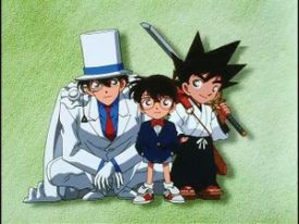 Image tirée du premier OAV Détective Conan, qui rassemble les héros des trois univers principaux d'Aoyama. - La dragonne sur le téléphone de Ran est une figurine de Namako-Otoko.